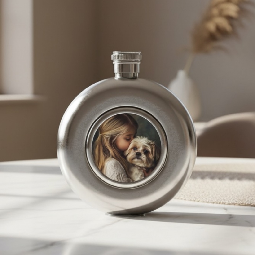 Elegantní kulatá placatka s vaší fotkou – osobní dárek s elegancí