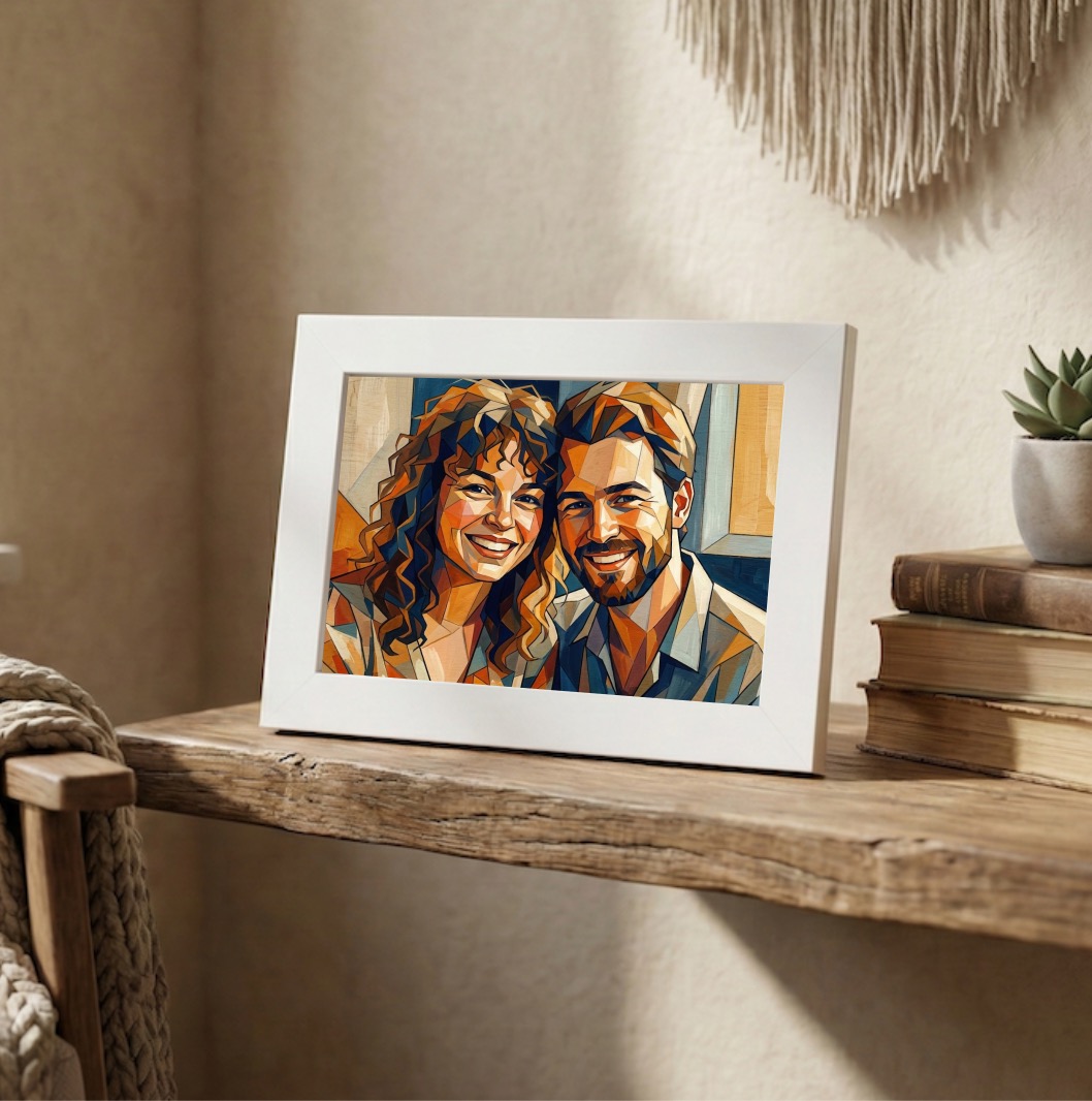Fotorámeček s ilustrací podle vaší fotky spojuje osobní příběh s moderním výtvarným zpracováním. Z dodané fotografie vznikne digitální portrét ve výrazném „mozaikovém“ (polygonálním) stylu: tváře a detaily jsou poskládané z geometrických ploch, které připomínají vitráž nebo facety krystalu. Výsledek působí čistě, současně a velmi reprezentativně – skvěle vynikne v interiéru a přitáhne pozornost barvami i strukturou.