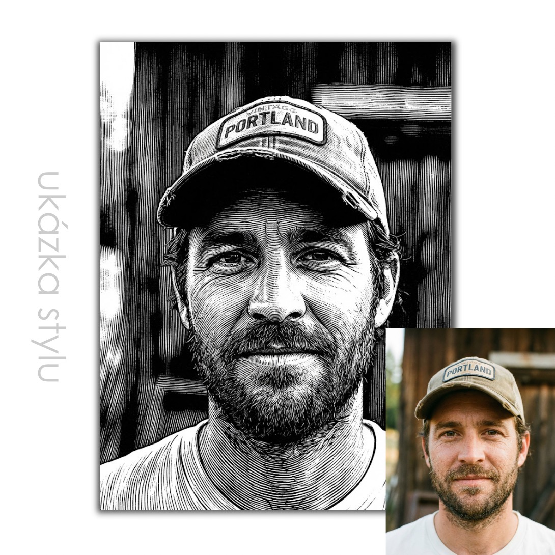 Z vaší fotografie vytvoříme stylizovanou kresbu a přeneseme ji na plátno jako hotový obraz. Výsledkem je čistý, nadčasový portrét s „ilustračním“ charakterem, který zvýrazní výraz, atmosféru a osobnost zachyceného okamžiku. Ideální, když chcete mít doma něco víc než jen vytištěnou fotku.
