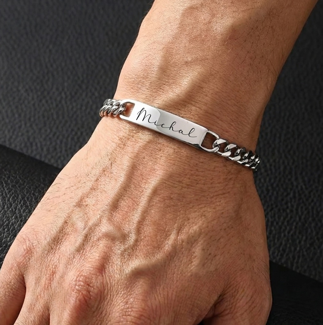 Náramek je vyrobený z nerezové oceli a tvoří ho řetízkový typ zapínání s hladkou destičkou uprostřed. Na destičku se umístí gravírované jméno či krátký nápis podle vašeho přání, díky čemuž je každý kus jedinečný. Celkový design působí čistě, moderně a snadno se kombinuje s dalšími šperky.