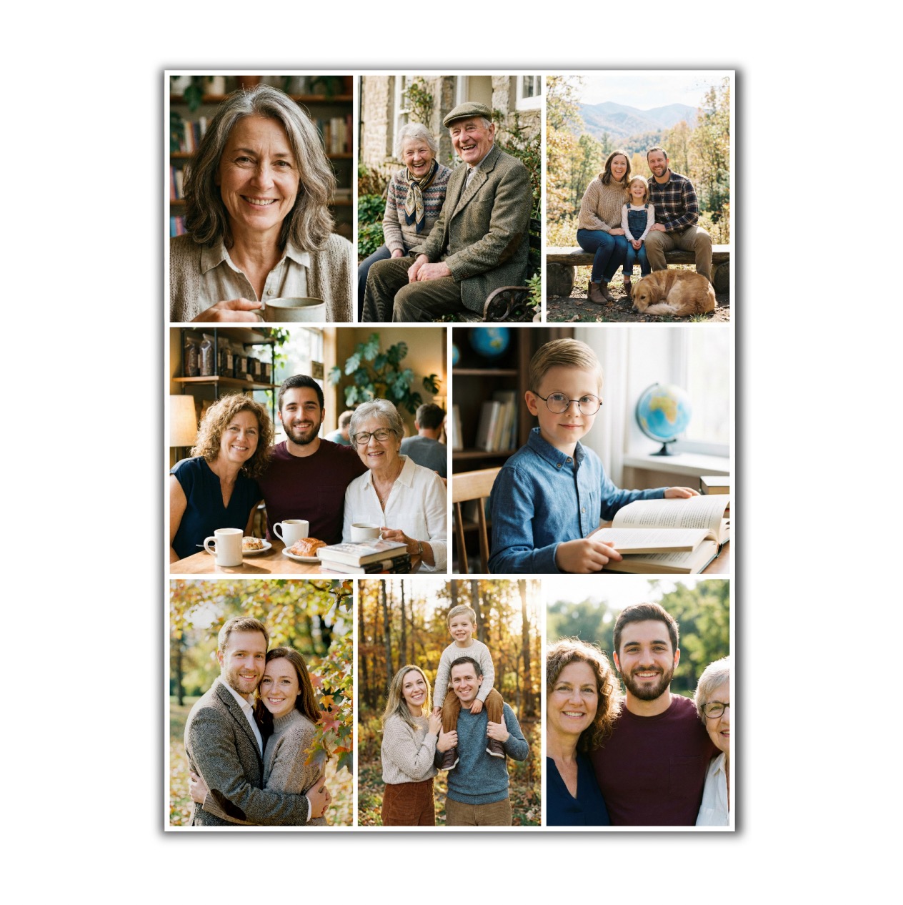 Vyberete až 10 fotek, které pro vás mají hodnotu a my z nich vytvoříme jednu stylovou fotokoláž, kterou vám vytiskneme na plátno vypnuté rámem. Výsledek je ideální pro zachycení příběhu – například „rodina, generace, děti, mazlíček“ v jednom obrazu.