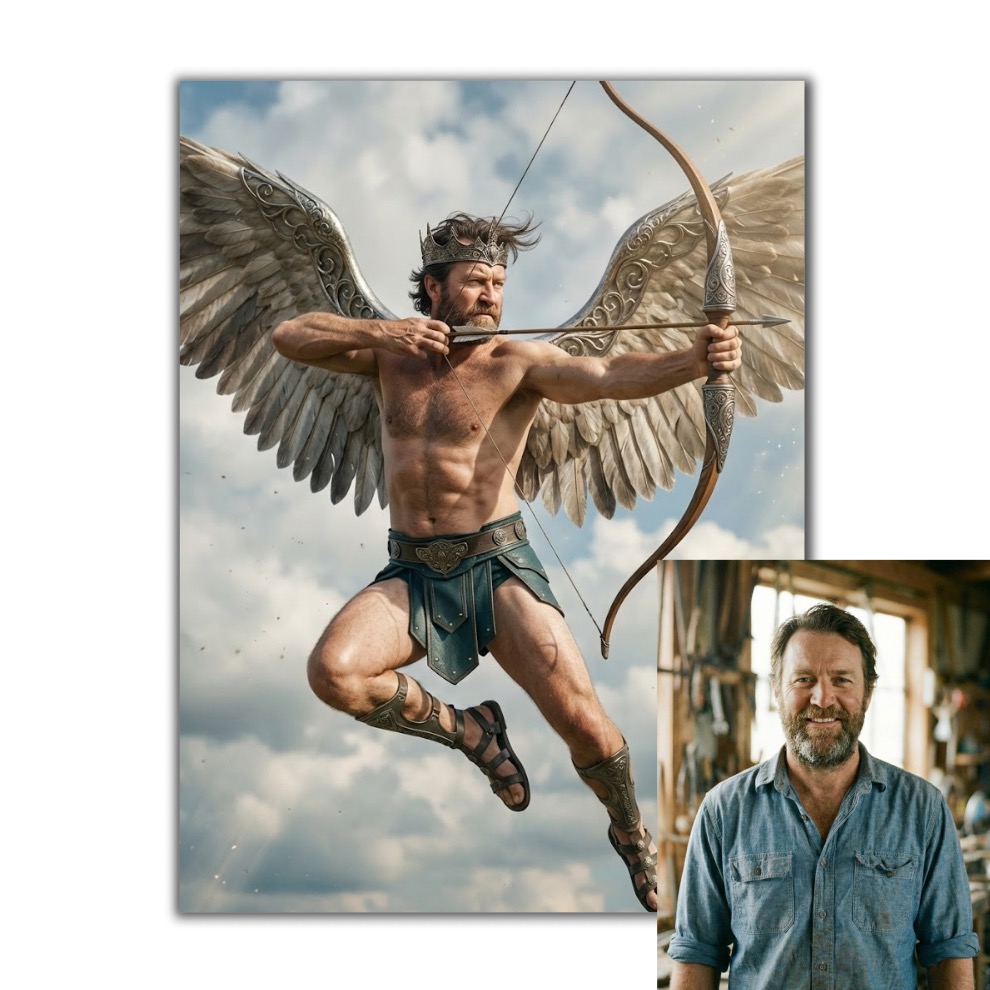 Chcete originální dekoraci, která bude opravdu vaše? Z vaší fotografie vytvoříme stylizovaný obraz na plátně, kde budete v roli andělského střelce s dramatickými křídly a lukem. Získáte osobní umělecký kousek, který zaujme na první pohled a skvěle se hodí i jako dárek.