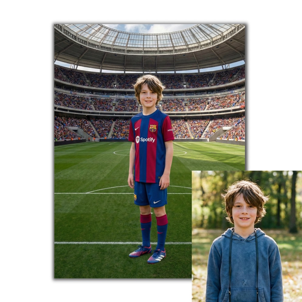 Chcete z obyčejné fotky udělat něco, co bude mít „wow“ efekt? Získáte personalizovaný obraz na plátně, kde se vy (nebo vaše dítě) proměníte ve fotbalistu slavného klubu – v dresu, na stadionu a ve stylu, který působí jako ilustrace z plakátu. Skvělý dárek i originální dekorace do pokoje.