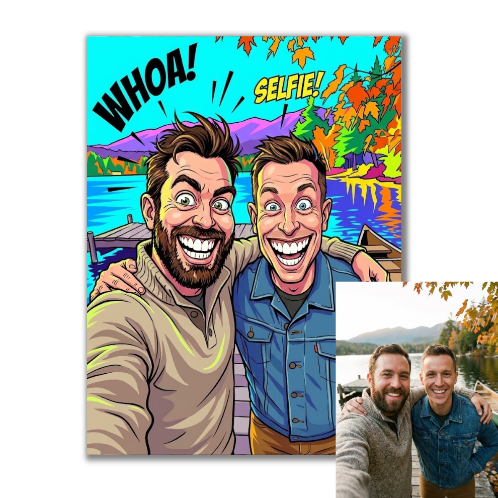Vytvoříme pro vás obraz na plátně v komiksovém stylu podle vaší fotografie. Zachováme podobu, výraz a atmosféru snímku, ale převedeme ji do výrazné ilustrace s živými barvami a typickým „komiksovým“ šmrncem. Výsledkem je moderní, hravý a výrazný kousek, který vypadá skvěle doma i v kanceláři.
